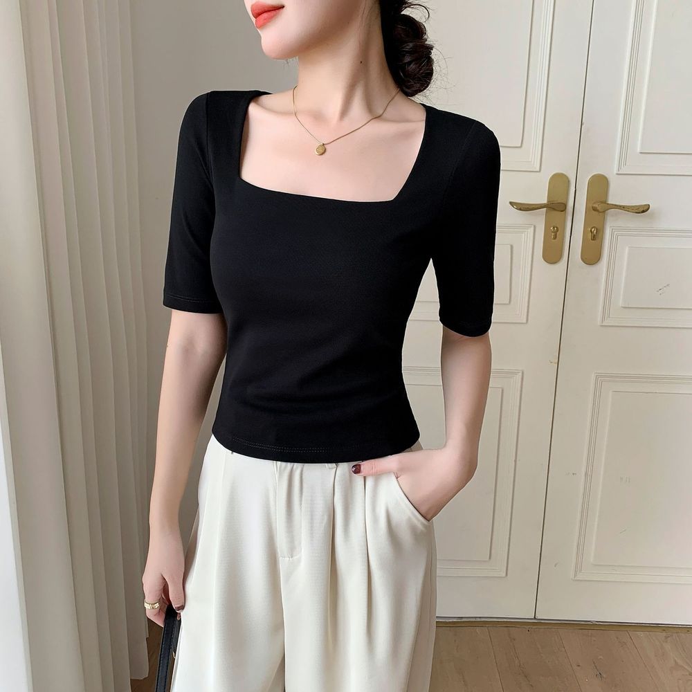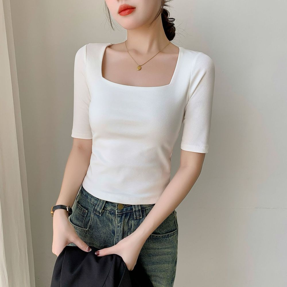 Women's Square Neck Mid Sleeve T-shirt Slim Short Top